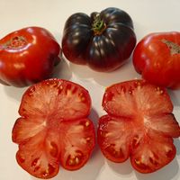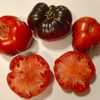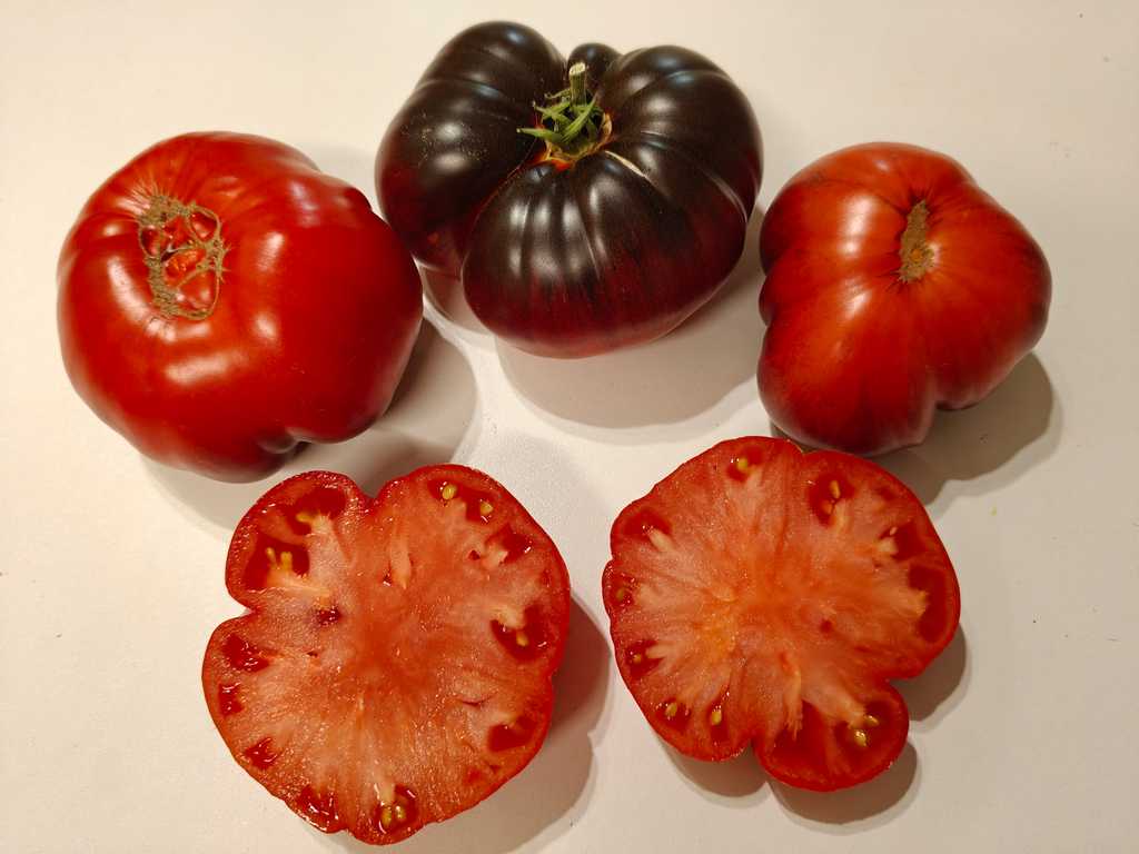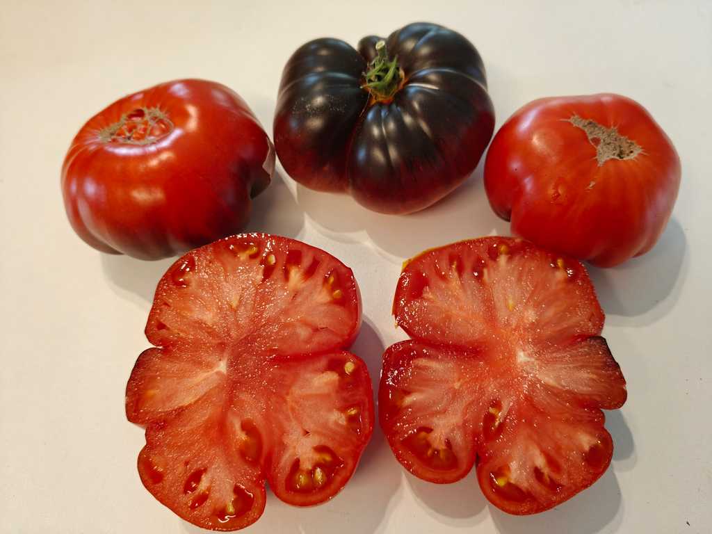 Frukterna är plattrunda, orangeröda, i början gulorangea med antocyaninrika axlar. Fruktköttet är hallonfärgat, köttigt, tätt, saftigt och sött, med en fruktig smak. Frukterna väger från 250 till 400 gram, vissa är större. En mycket smakrik salladssort. Korsning mellan Great White Blues och Dirty Curty.