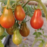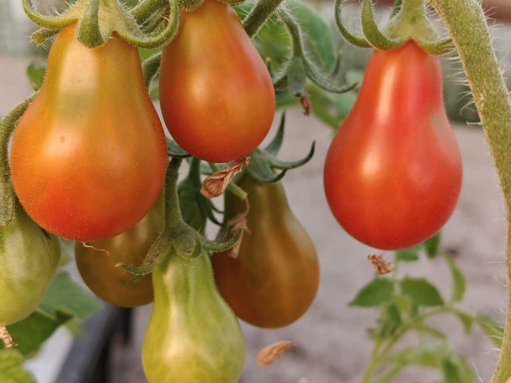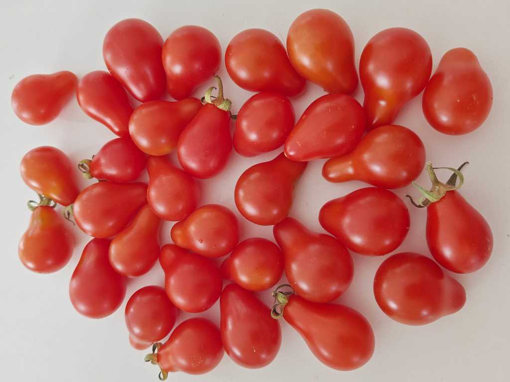 Denna sort ger små röda frukter med en karakteristisk liten päronform. Saftiga och riktigt söta.