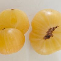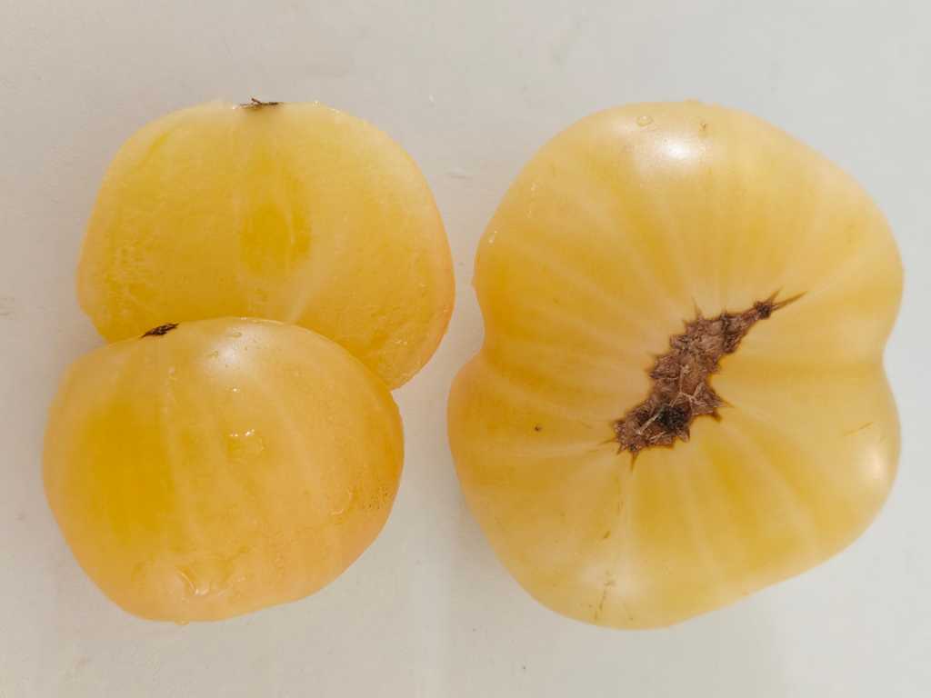 Rund bifftyp med lätt rundade och bågiga axlar. Krämvitt till ljusgult skal med en rosa slöja vid mognad, särskilt synligt vid toppdelen. Fruktköttet krämvitt med rosa marmorering, särskilt synligt i slutet av säsongen. Mild smak utan att vara fadd som många "vita".
