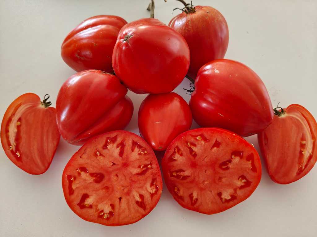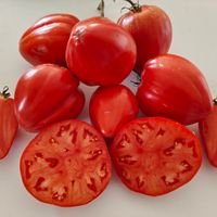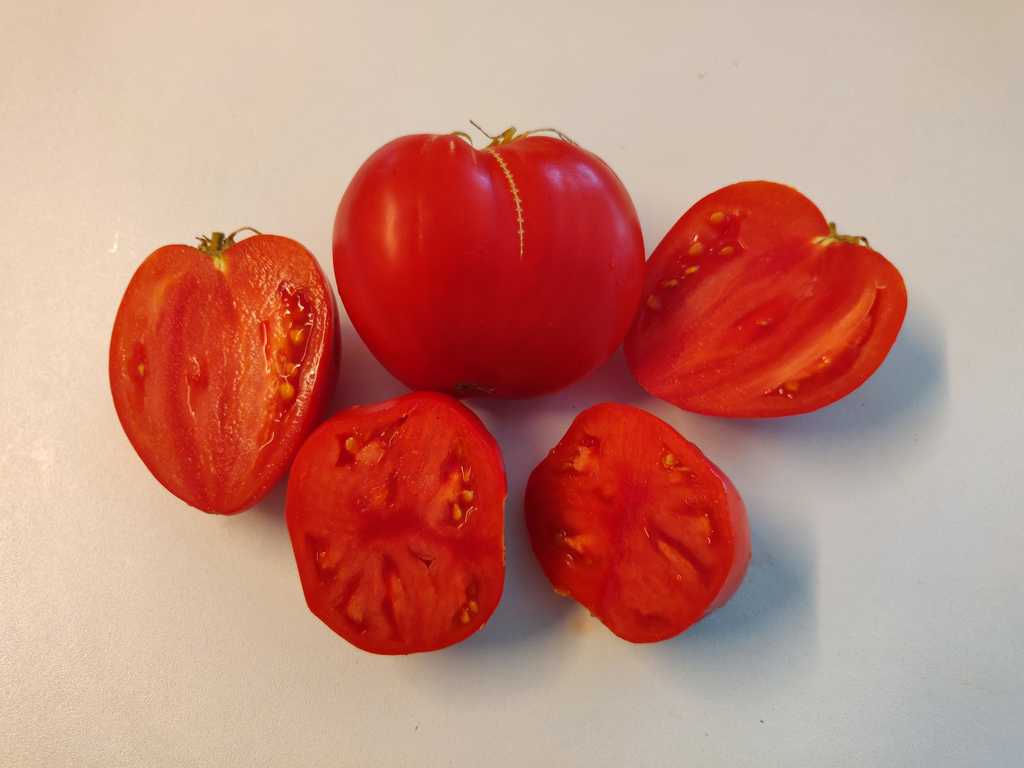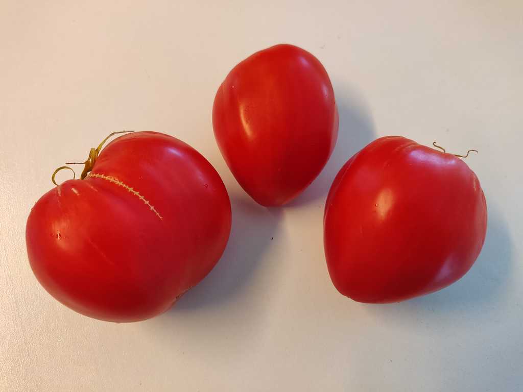 Frukterna är röda, hjärtformade, vissa liknar tuppkam och väger 200-400 g. Med korrekt växtvård många trädgårdsmästare får tomater som väger från 1000 till 1500 g. Fruktkött är aromatiskt, köttigt, tätt, sött och utsökt. Utmärkta för sallader, pasta och såser. Kännetecknas av god fruktsättning i varmt väder. Hög sjukdomsresistens och hög avkastning.