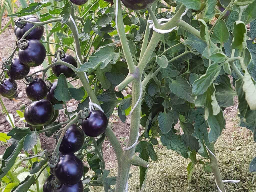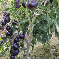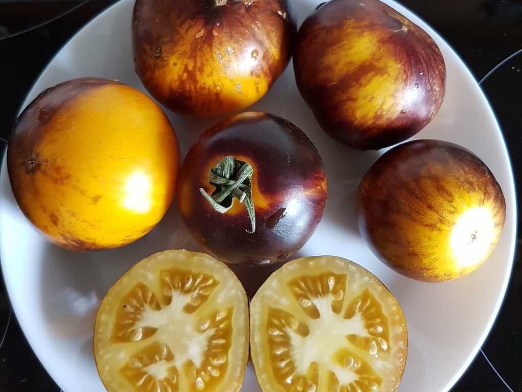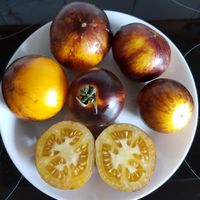 Rund frukt från 80 till 150 gram. Gul färg strimmig med mycket mörkblå, nästan svart (spår av anthocyanin), svarta axlar. Saftigt kött med mycket gel och frön. Smaken är bäst när frukterna är väl utsatta för solen. Växt med stor utveckling, 180cm hög. Generösa mellansäsongsskördar.