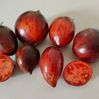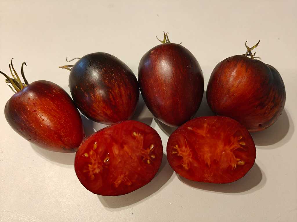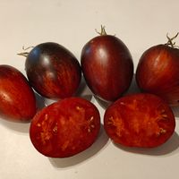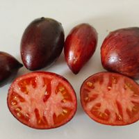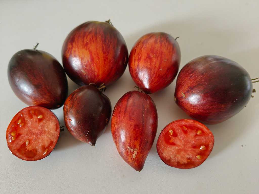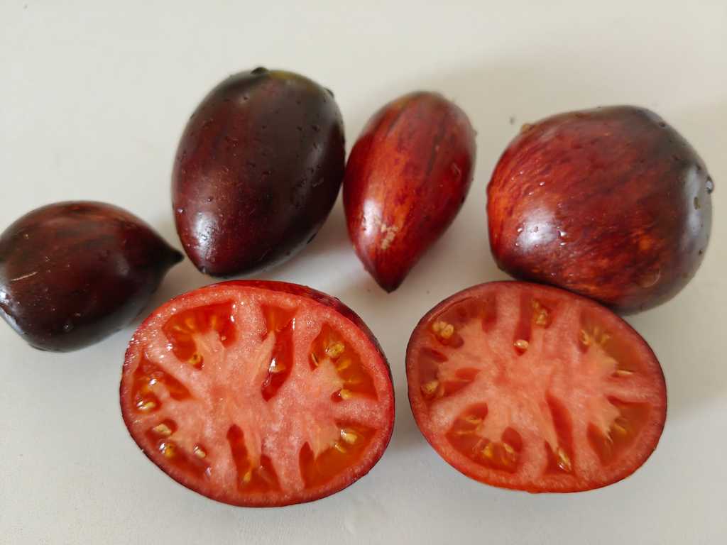 Pastatomat som ger stor skörd av läckra ovala frukter med liten spets. Vackra frukter med rött och fast fruktkött, mycket rik och fruktig smak. Frukterna har läcker färg med indigoblå inslag och väger ca 100 gram.