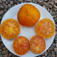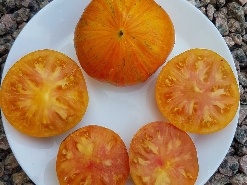 Vackra orange hjärtformade frukter med gula render och spets. Orange-gult fruktkött marmorerat med rosa, ordentligt mogna frukter får rött kött, marmorerad med gult. Frukter har söta och fruktiga tropiska smaker och mycket lång hållbarhet.