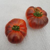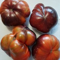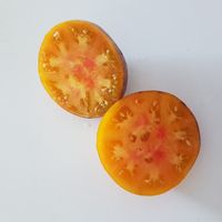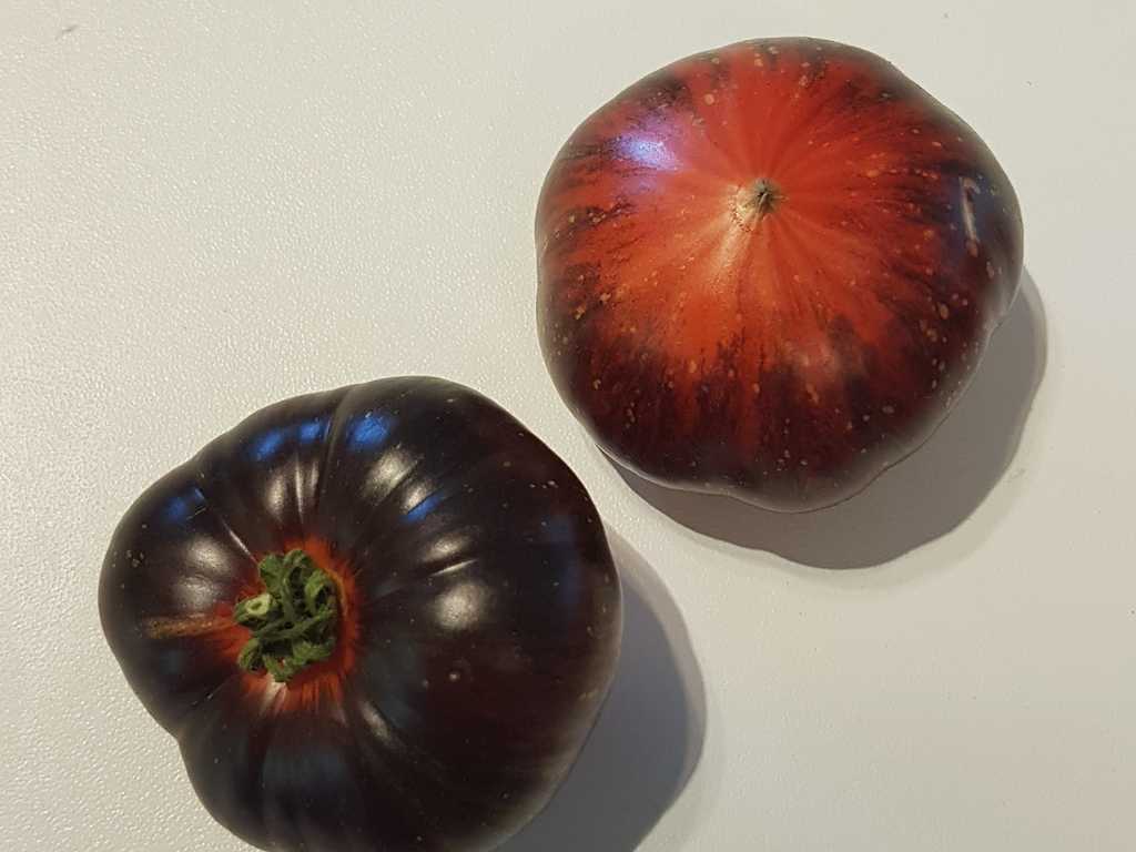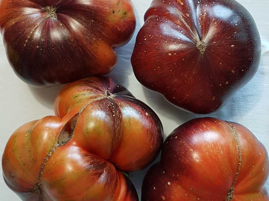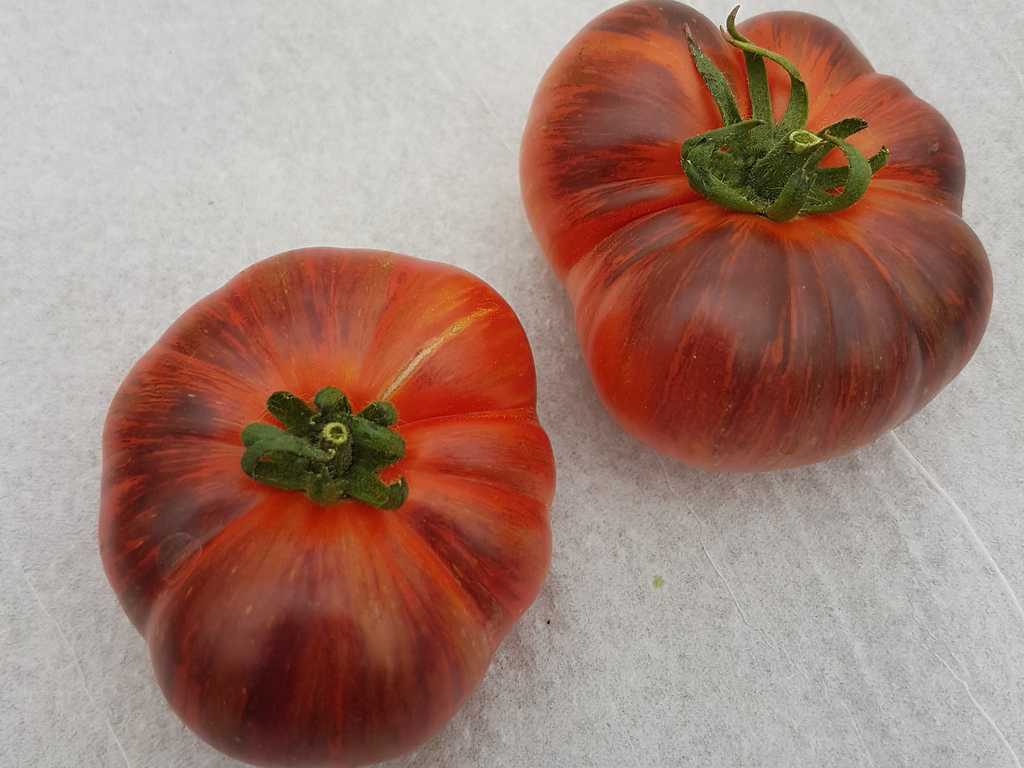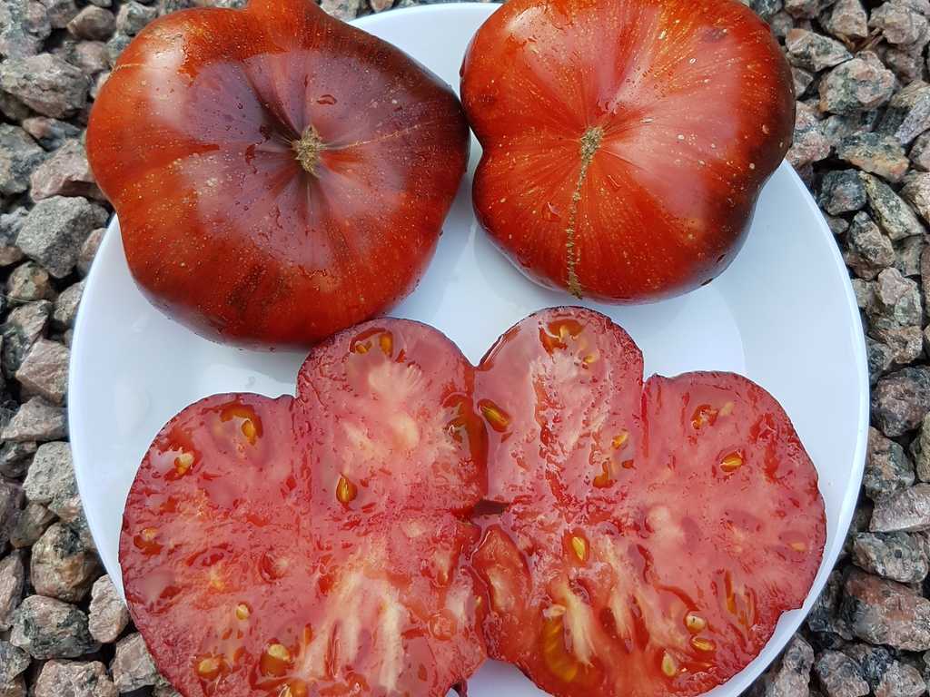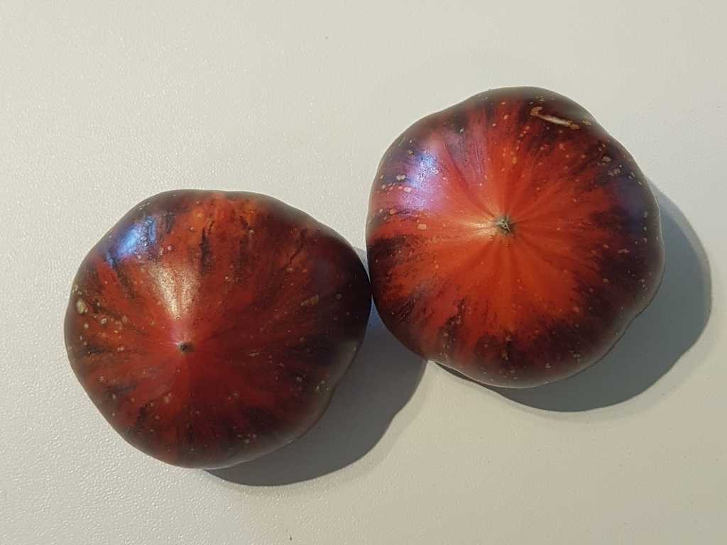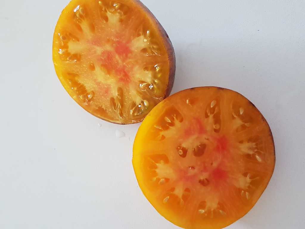 Plattrunda frukter med 150-300 gram, ljusröd, mättad färg, med anthocyanin axlar och gyllene linjer, otroligt exotiska i utseende. Smaken är söt, intensiv, med en jämn surabalans. Resistent mot olika sjukdomar, sätter frukt upp till kallt väder.