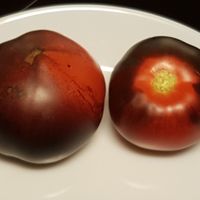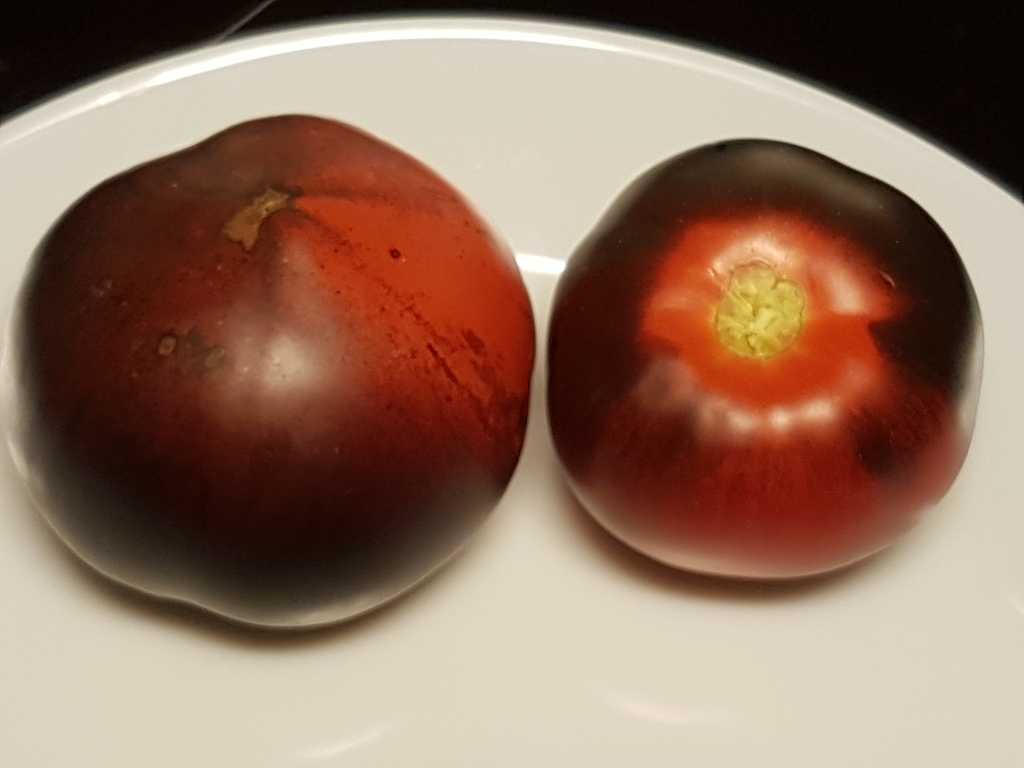 Färgen på frukten liknar på flammande kol. Frukten är rund med en vikt av 80 till120 gr. När de slutligen mognar har tomaterna intensiv röd färg med intensiva nästan svarta axlar. Massan är tät, röd färgad med en underbar, mycket rik tomatfruktsmak.