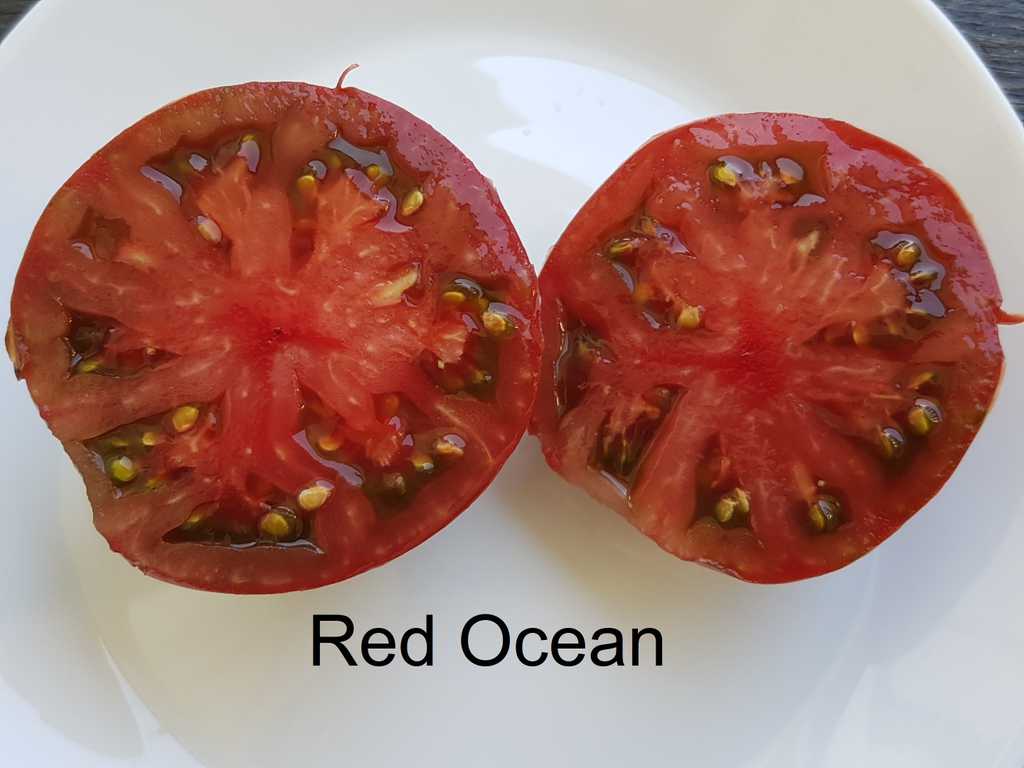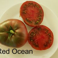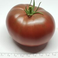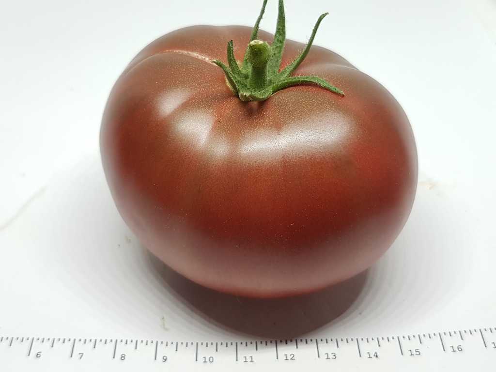 Stora frukter som väger 200 till 350 gram, bifftyp, något ribbad. Mörkröd-lila färg på den nedre halvan medan fruktens topp är en lutning från ljusgrön till mörkgrön. Nötkött med en kryddig och komplex smak. Stark växt med stor stam.