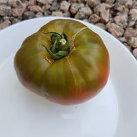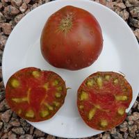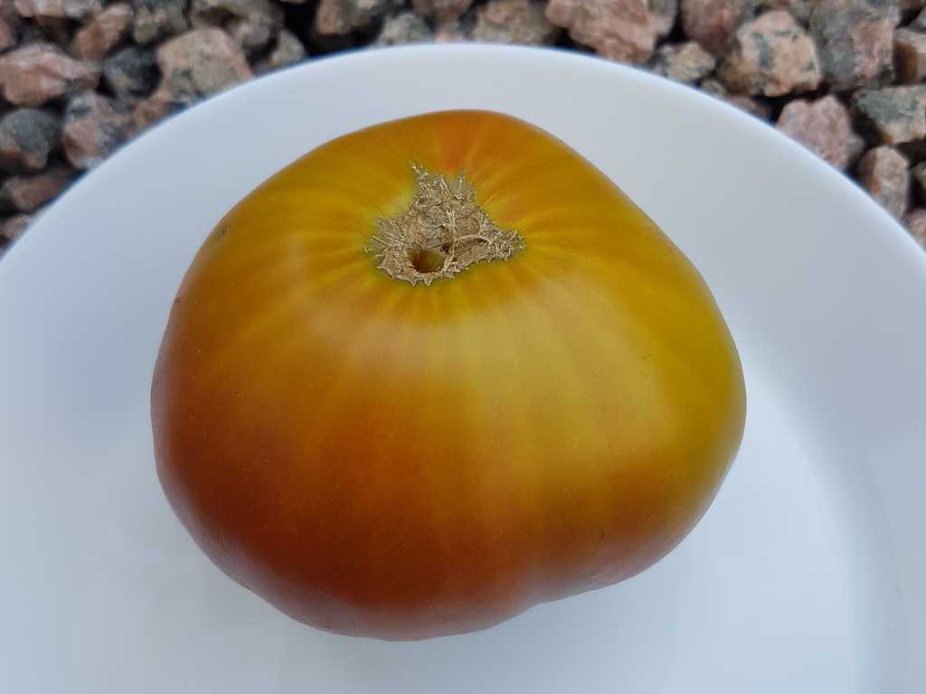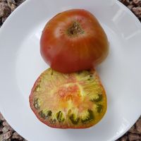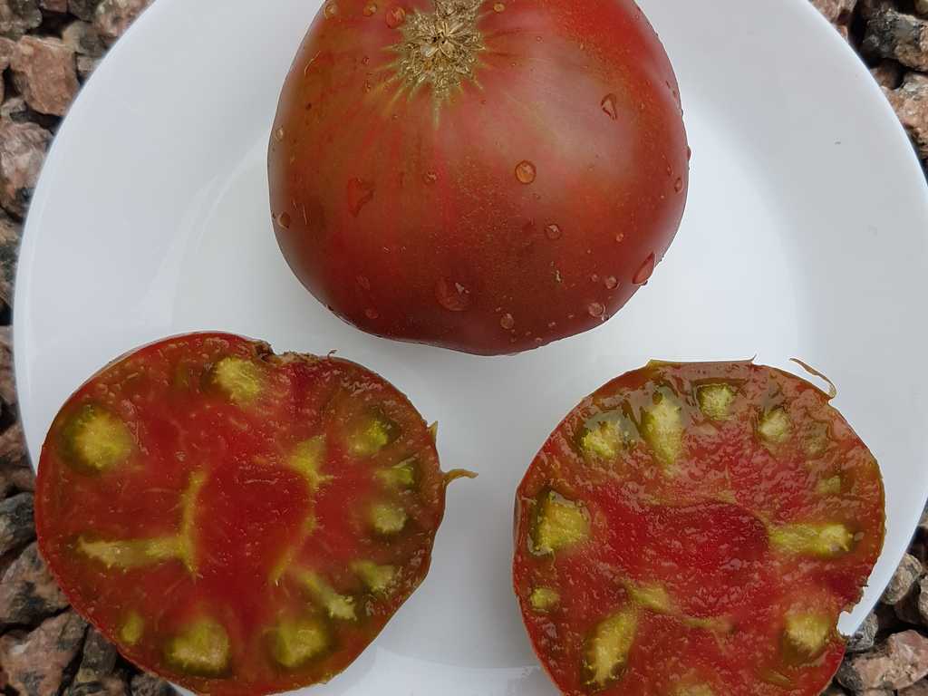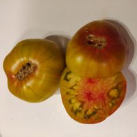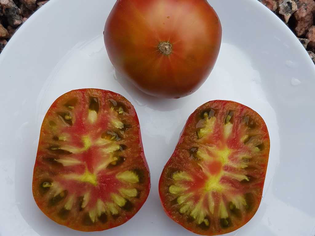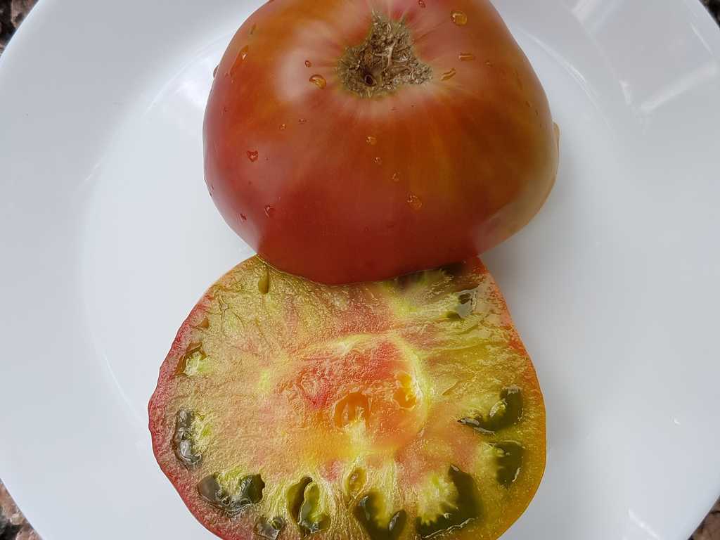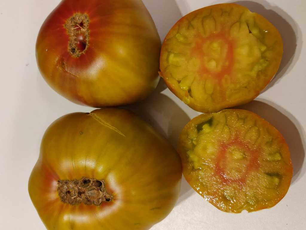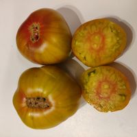 Läckert trefärgade/flerfärgade mellanstora gröngula bifftomater. Mycket vackert tropiskt utseende som uppskivad, med en tydlig röd prick i mitten! Tomaterna är plattrunda och väger ca 180-250 g. Smakrik, lätt syrlig och tomaterna är saftiga med en lätt ton av både honung och lätt beska. Tidig sort.