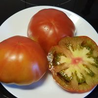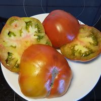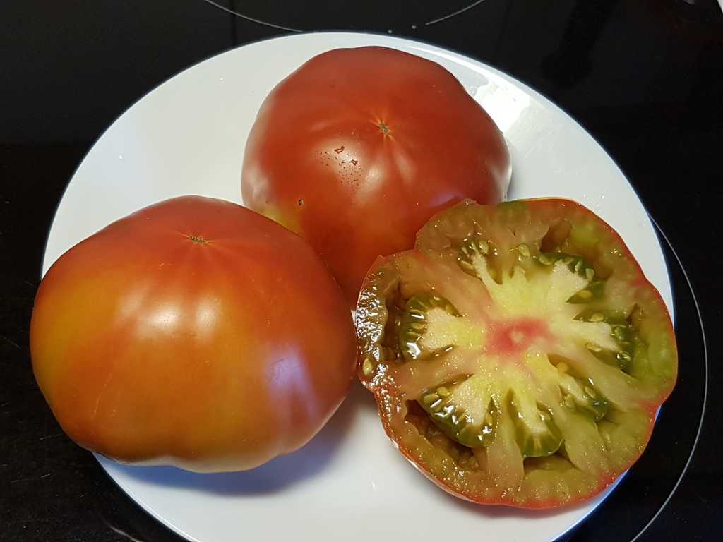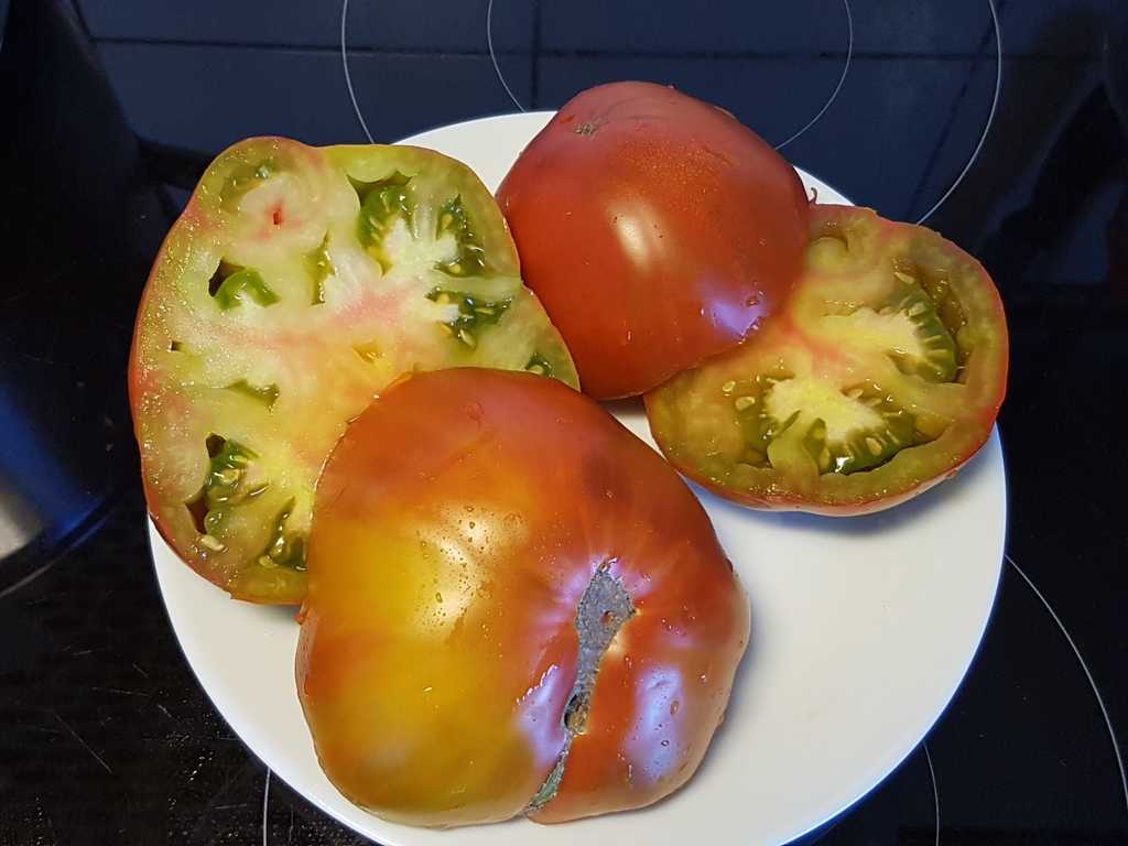 Ny sort, korsningen av "Malakhitovaya Shkatulka". Runda biff frukter från 200 till 400 gram, lätt tillplattade och mer eller mindre räfflade i toppen. Grön-röd-gul i färg. Grönt fruktkött marmorerat med rött i mitten. Fruktig och uppfriskande smak.