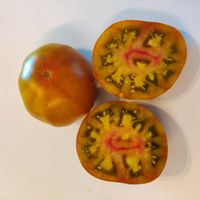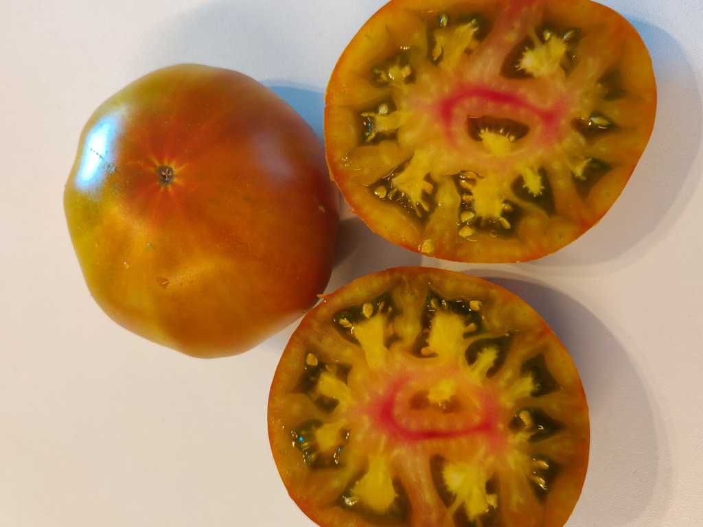 Tomater är platt-runda, väger 200-300 g, lika stora till toppen av busken. Ljusgrön-vinröd-brons flerfärgad. Massan är mycket saftig och smörig, grön i sektionen med vinröd kärna. Smaken av tomat är söt, fruktig, uppfriskande. För färsk konsumtion