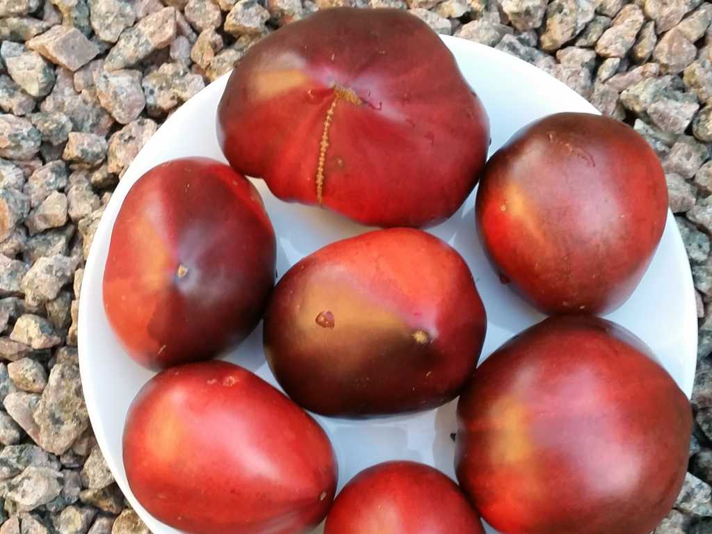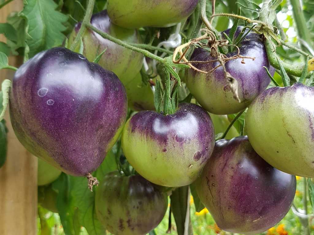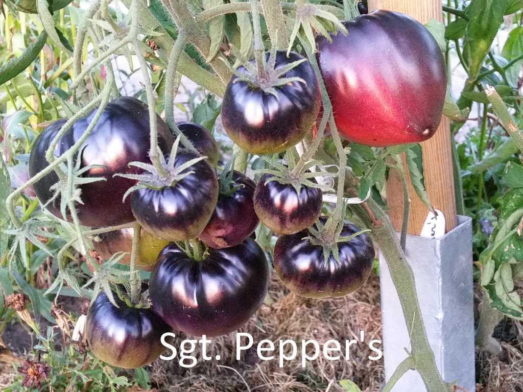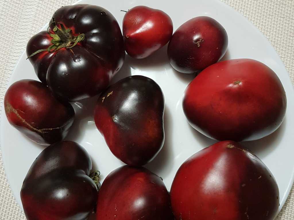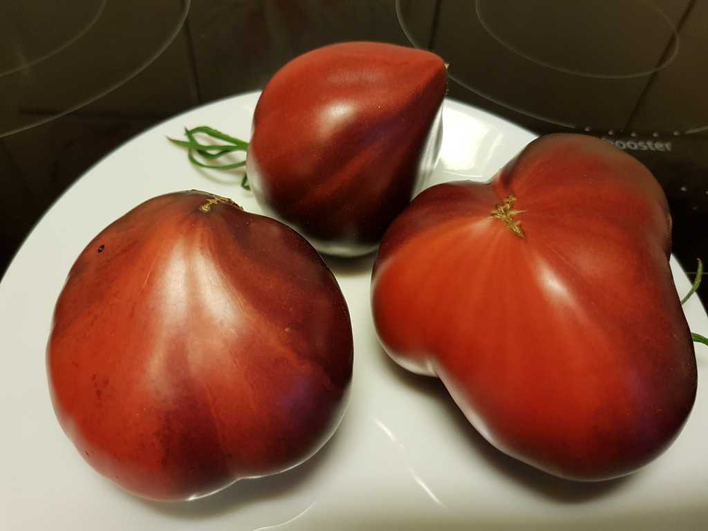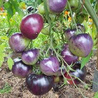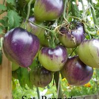 200 cm hög, mycket producerande sort. Tomater är hjärtformade, mycket vackra i mognadsstadiet - rödlila med en stark anthocyanin beläggning på axlarna. Köttet är rosa-crimson, saftig, doftande, mycket bra balanserad smak. Ju mer solljus växten av denna tomat får, desto mer harmonisk blir fruktens smak och färgen blir blåare. Fruktens vikt är 150-300 g. Lagras länge.