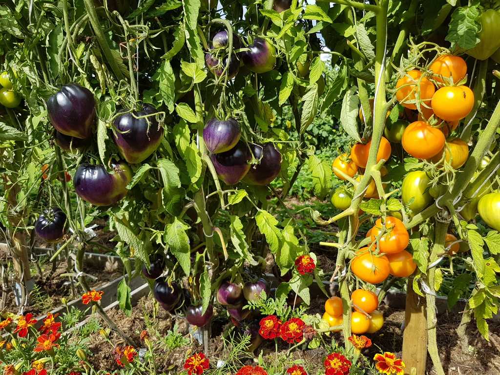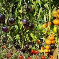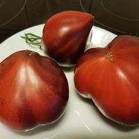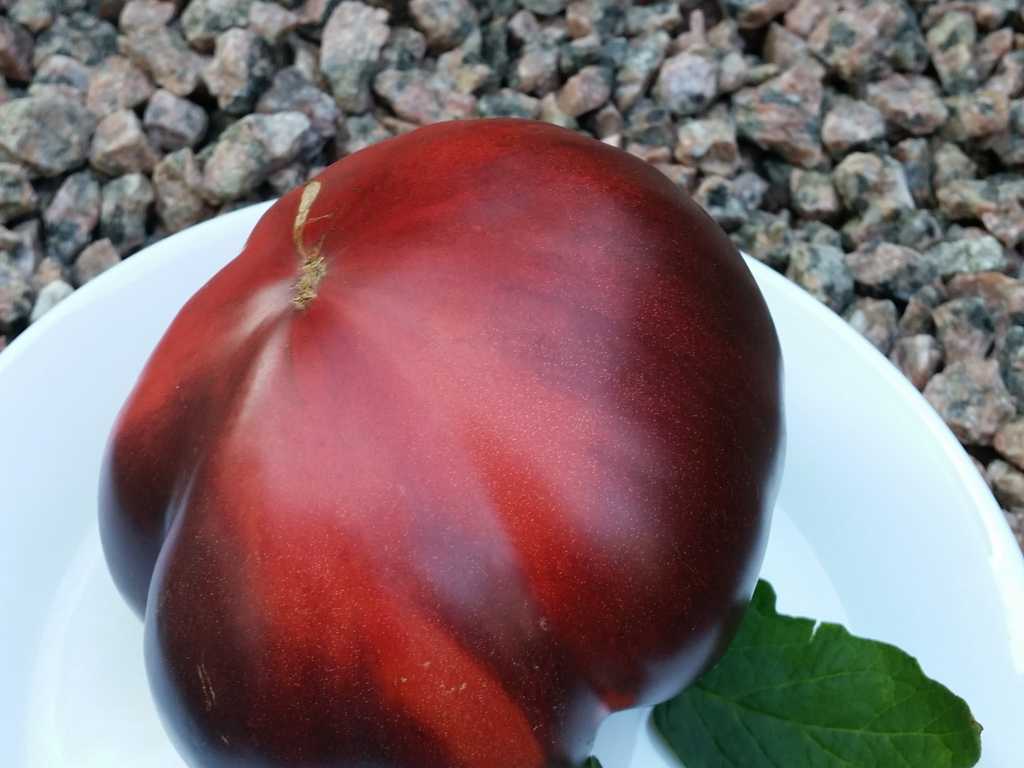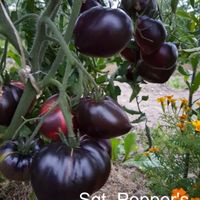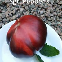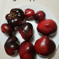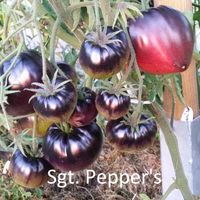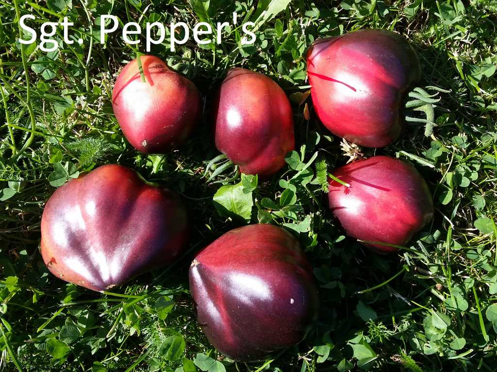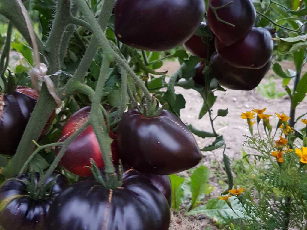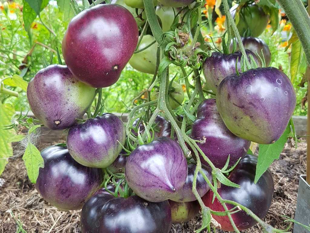 200 cm hög, mycket producerande sort. Tomater är hjärtformade, mycket vackra i mognadsstadiet - rödlila med en stark anthocyanin beläggning på axlarna. Köttet är rosa-crimson, saftig, doftande, mycket bra balanserad smak. Ju mer solljus växten av denna tomat får, desto mer harmonisk blir fruktens smak och färgen blir blåare. Fruktens vikt är 150-300 g. Lagras länge.