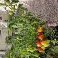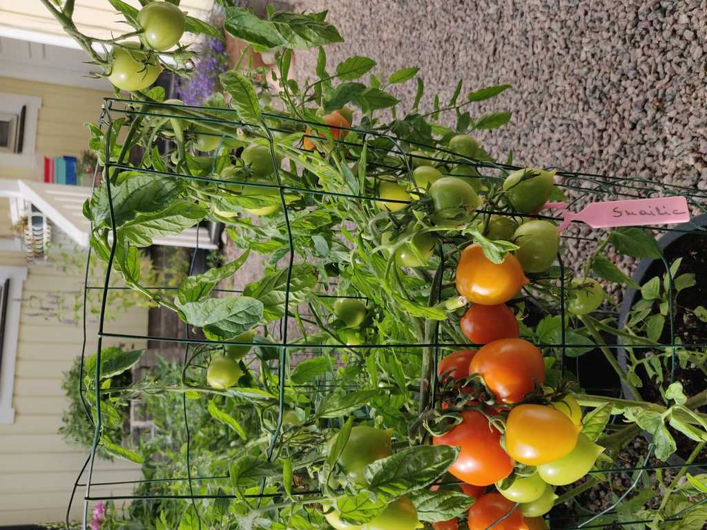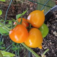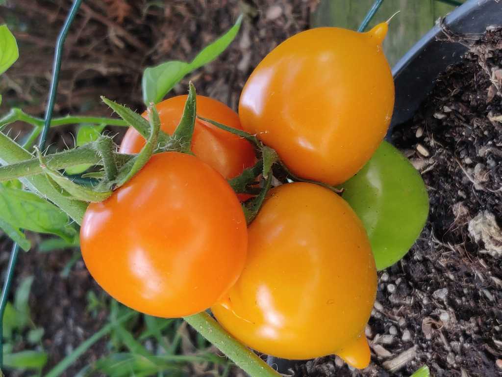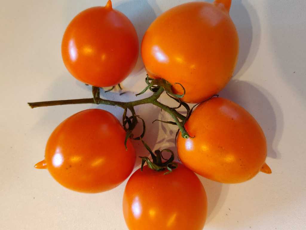 Tidig sort, 70-90 cm buske med skarpt orangea frukter med spets. Goda tomater passar bra att äta färskt, konservera eller koka såser.