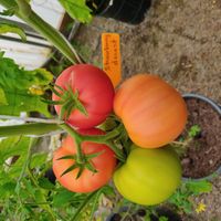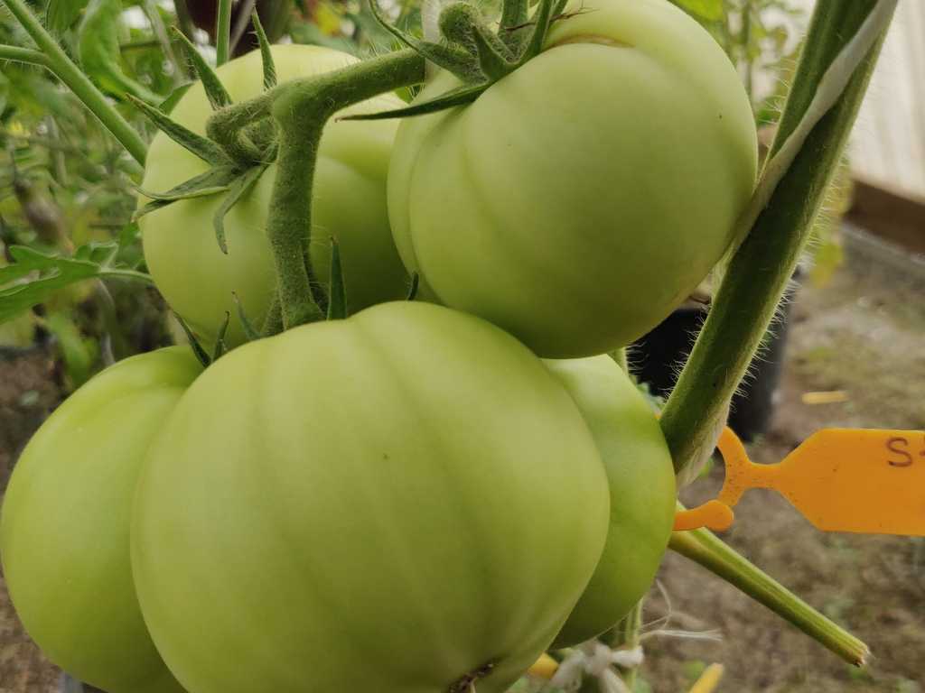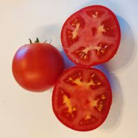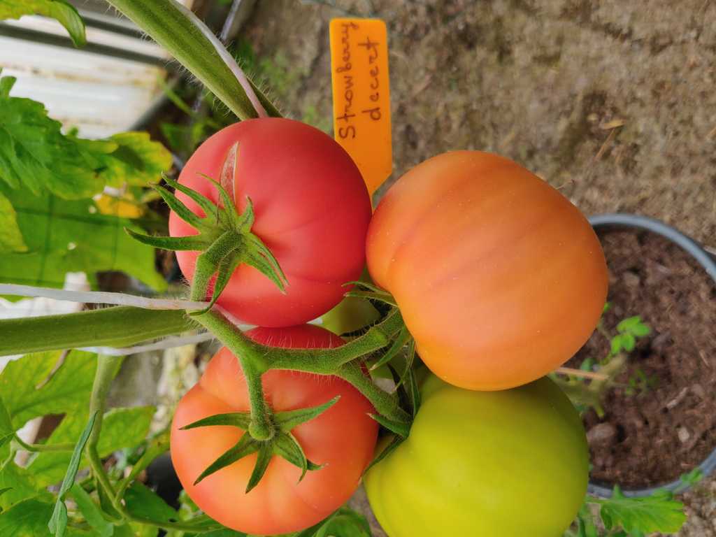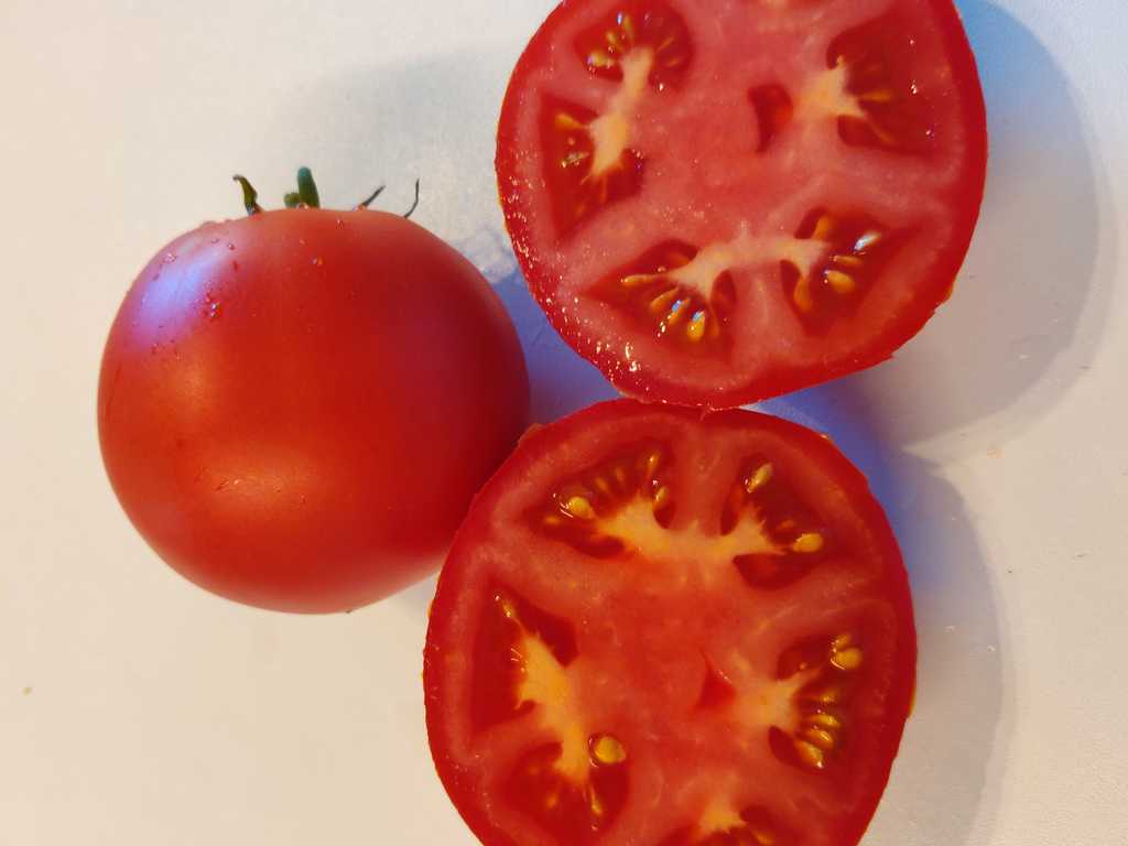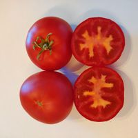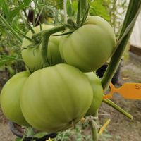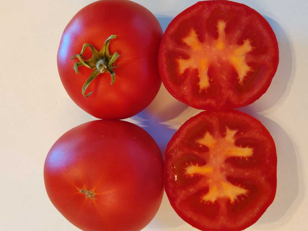 1,8m hög planta. Tomater är runda, större frukter är platt-runda, saftiga, har god söt smak.