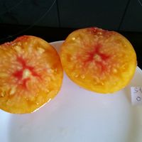 Hjärtformad frukt från 150 till 300 gram. Slät epidermis med stora gula / orange och röda vener. Saftig, tät och köttig tvåfärgad fruktkött som innehåller få frön, doftande och söt smak. Mycket bra och regelbunden produktion från mitten av säsongen till de första frost.