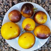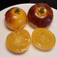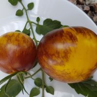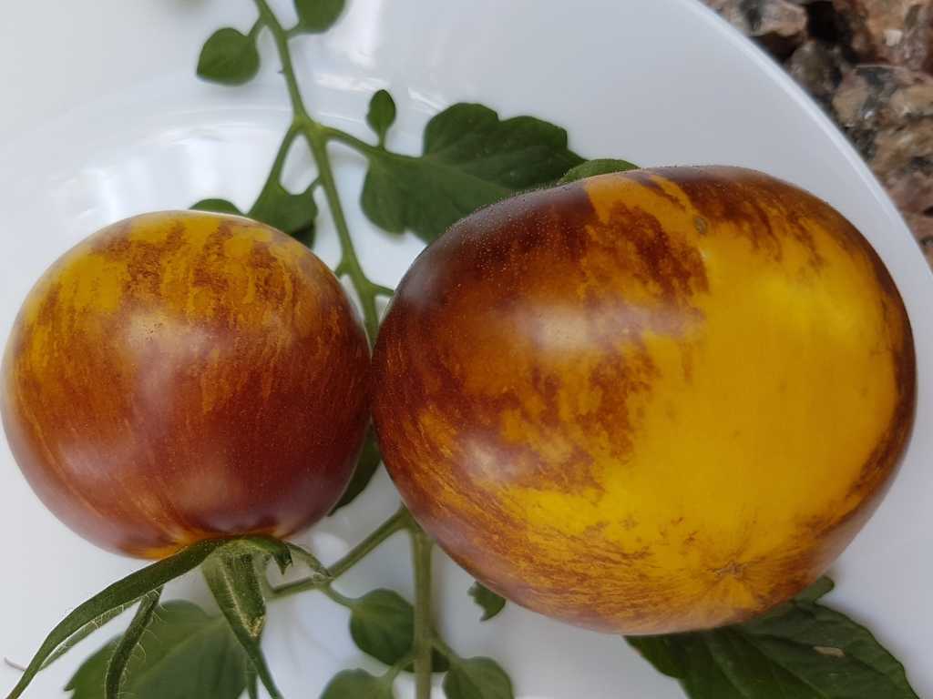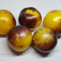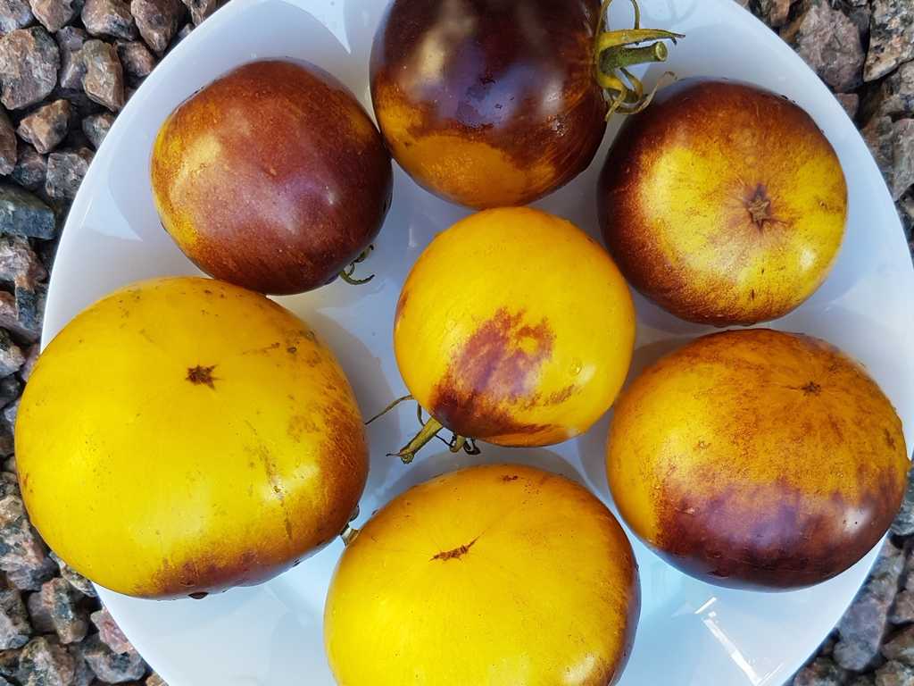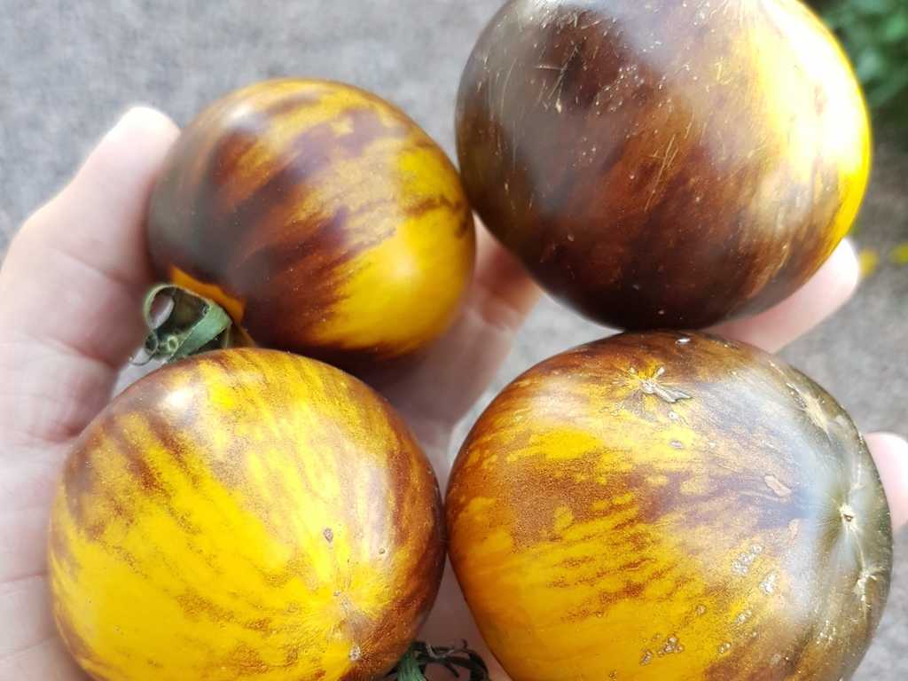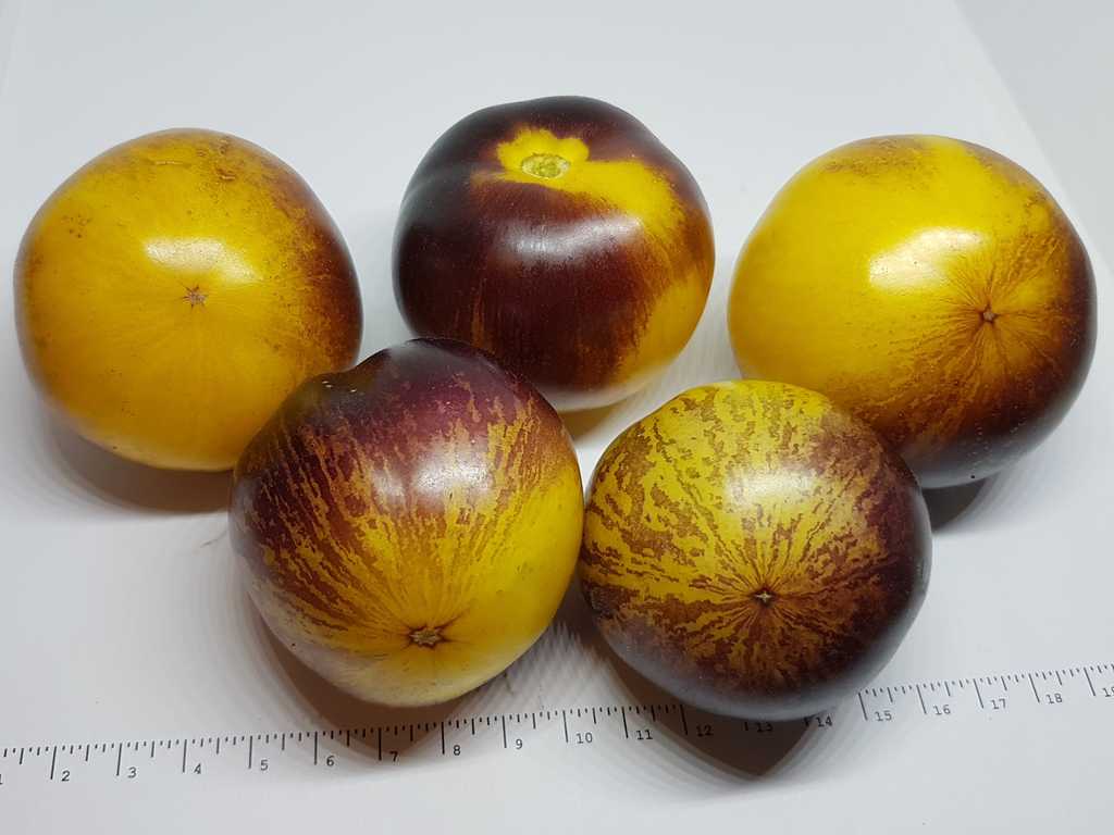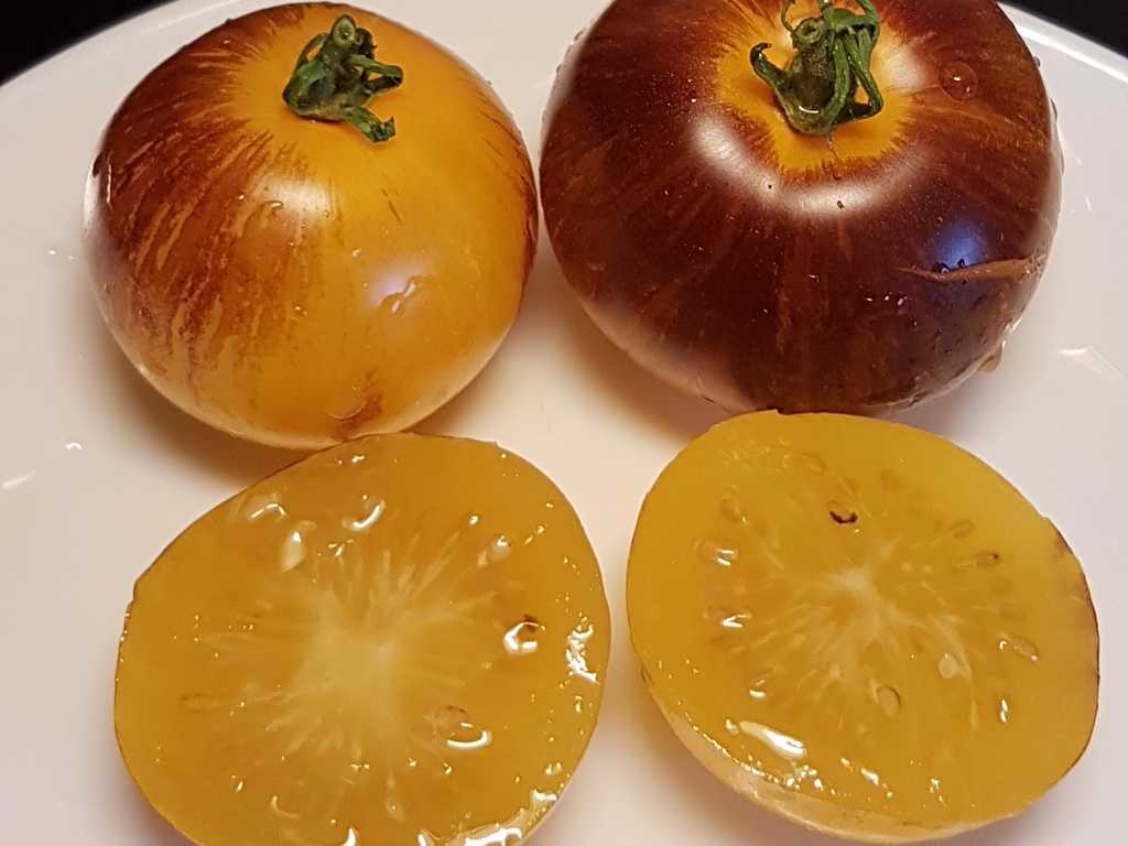 En högväxande sort framtagen av Tom Wagner som ger mellanstora tomater med vackert varmgul-orange botten med lilabruna, strimmiga axlar och gul insida. En riktig snygging! Smaken är bäst när frukten är väl utsatt för solen.