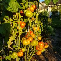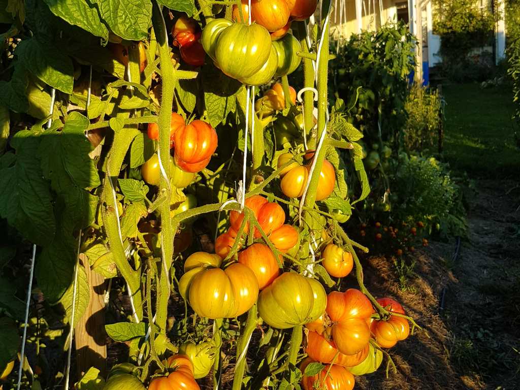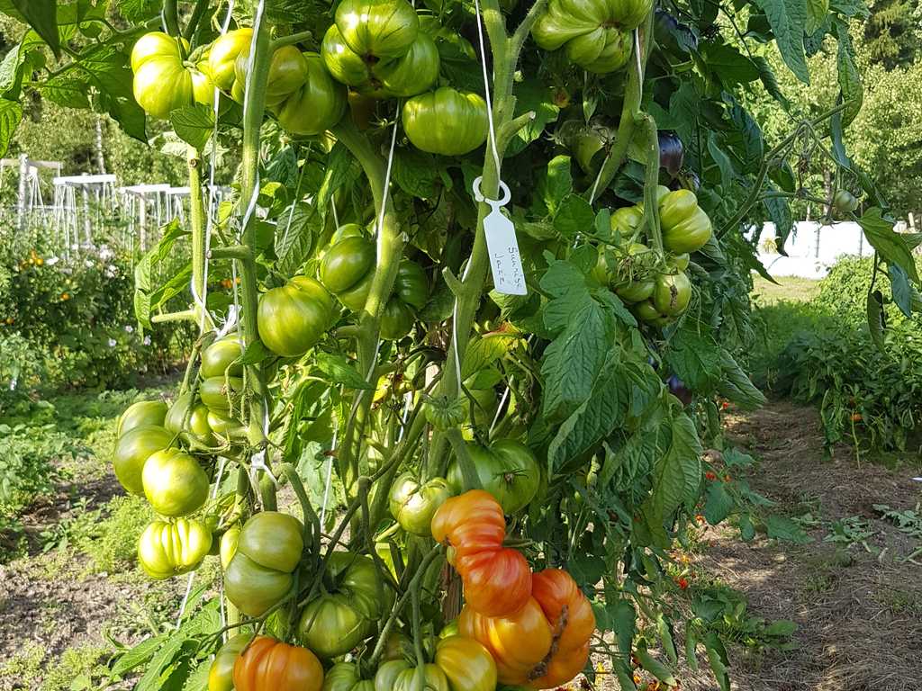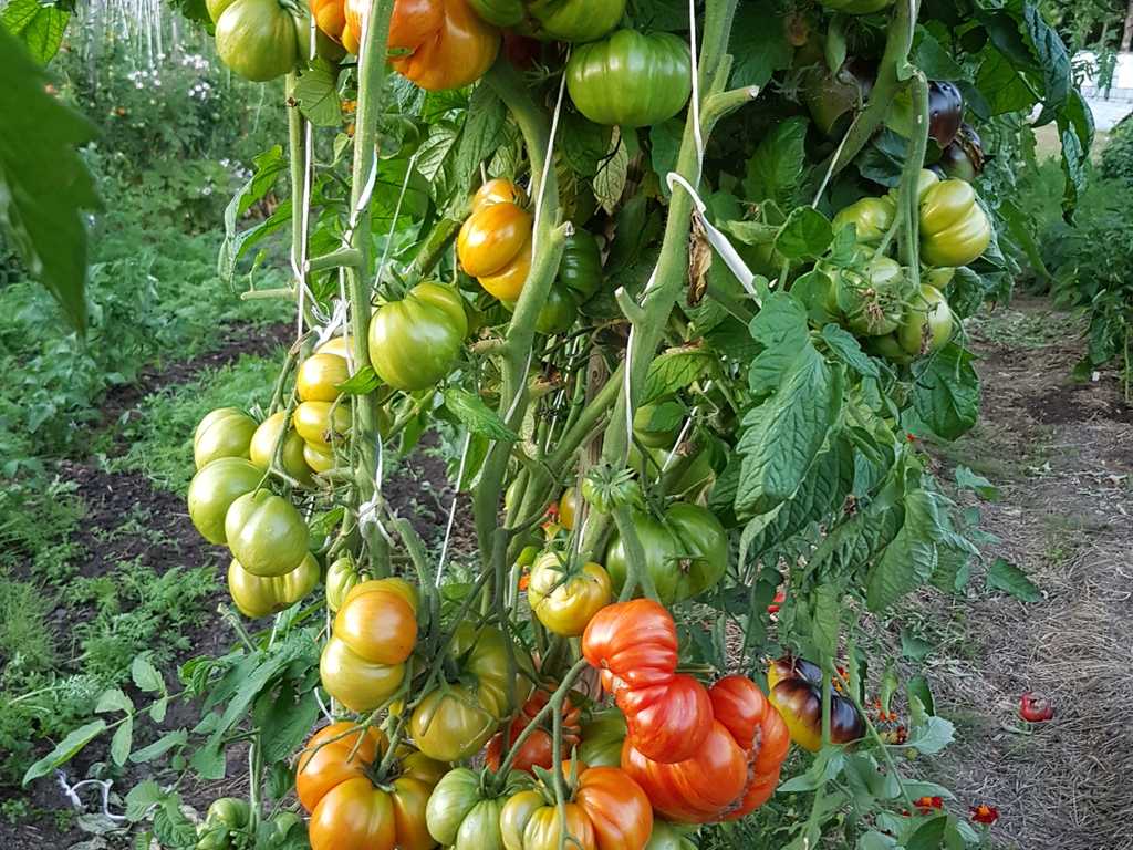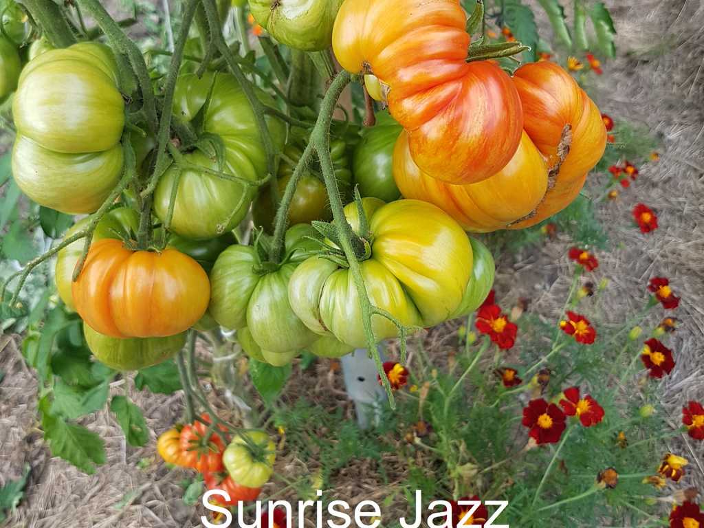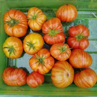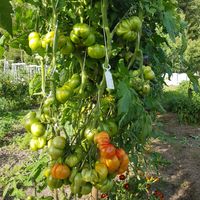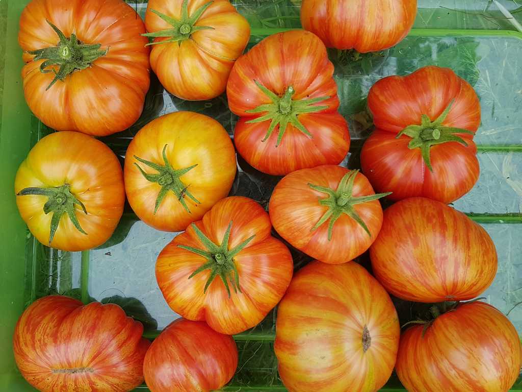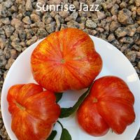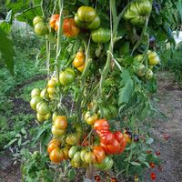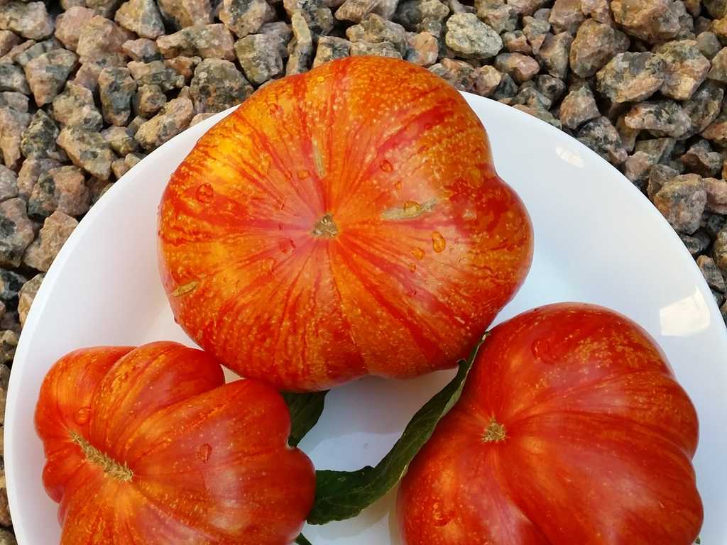 Frukt som väger 200 till 450 gram, biff-typ, plattrund, mer eller mindre ribbad. Röd färg med gula strimmor. Tätt, saftigt ljusrosa kött med mörkrosa marmorering i mitten. Kraftig växt med stora stjälkar, stor utveckling, obestämd tillväxt. Mycket bra, regelbunden mellansäsongsproduktion.