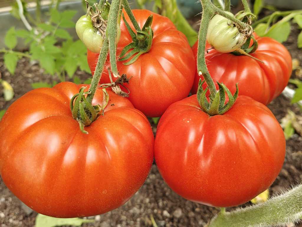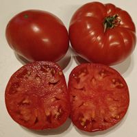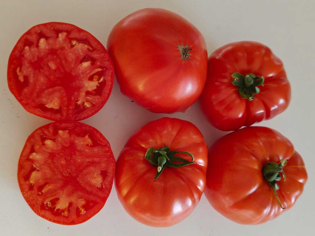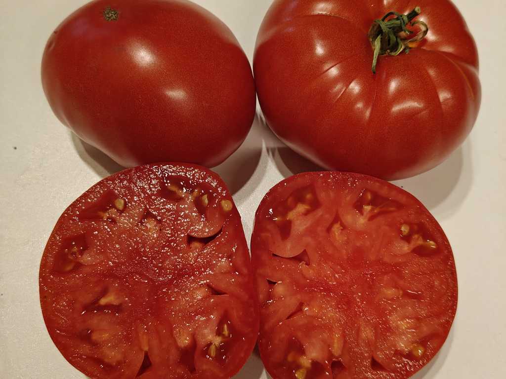 Upp till 2,0 m hög (och mer). Form: platt-runda bifftomater. Vikt: 200-800 gram, upp till 1,0 kg. Färg: hallonröd, blir mer intensiv när den är övermogen. Fruktköttet är tätt, köttigt och saftigt. Smaken är klassisk, med den fylliga aromen av "riktiga" tomater och en delikat syra. Utbytet är extremt högt!!!