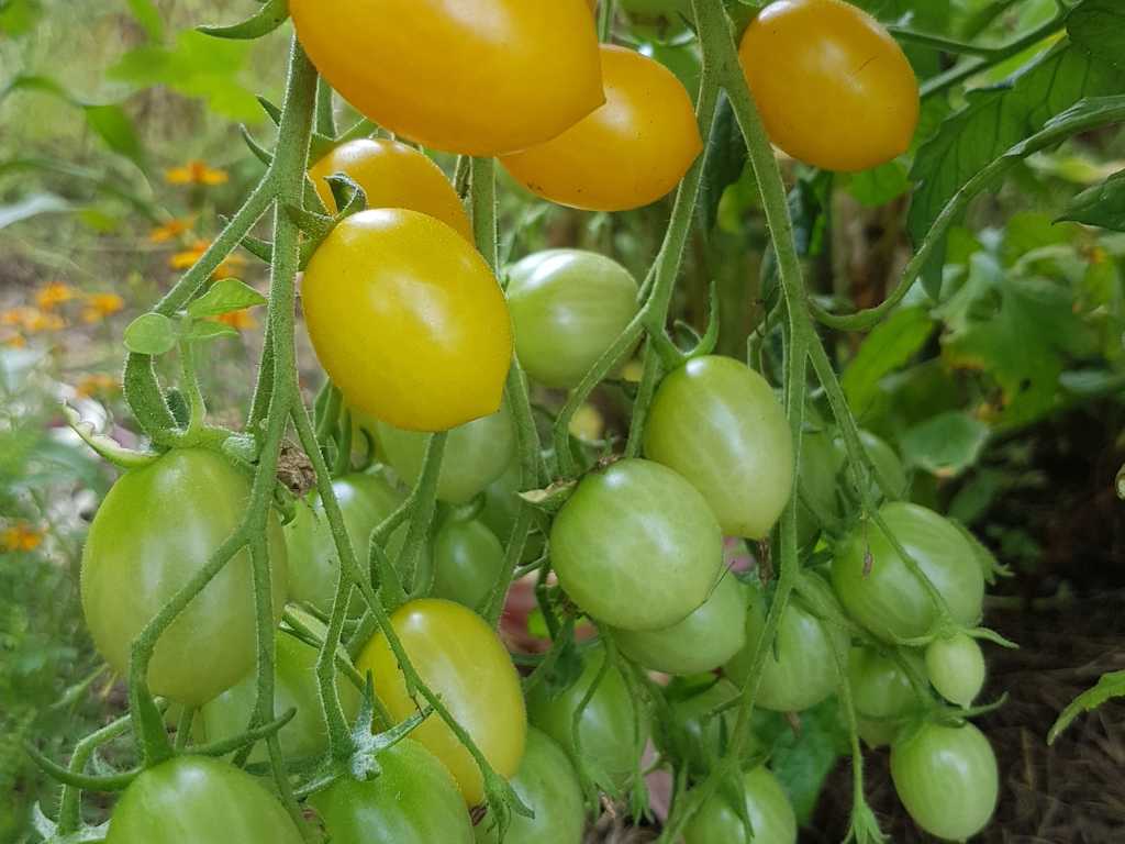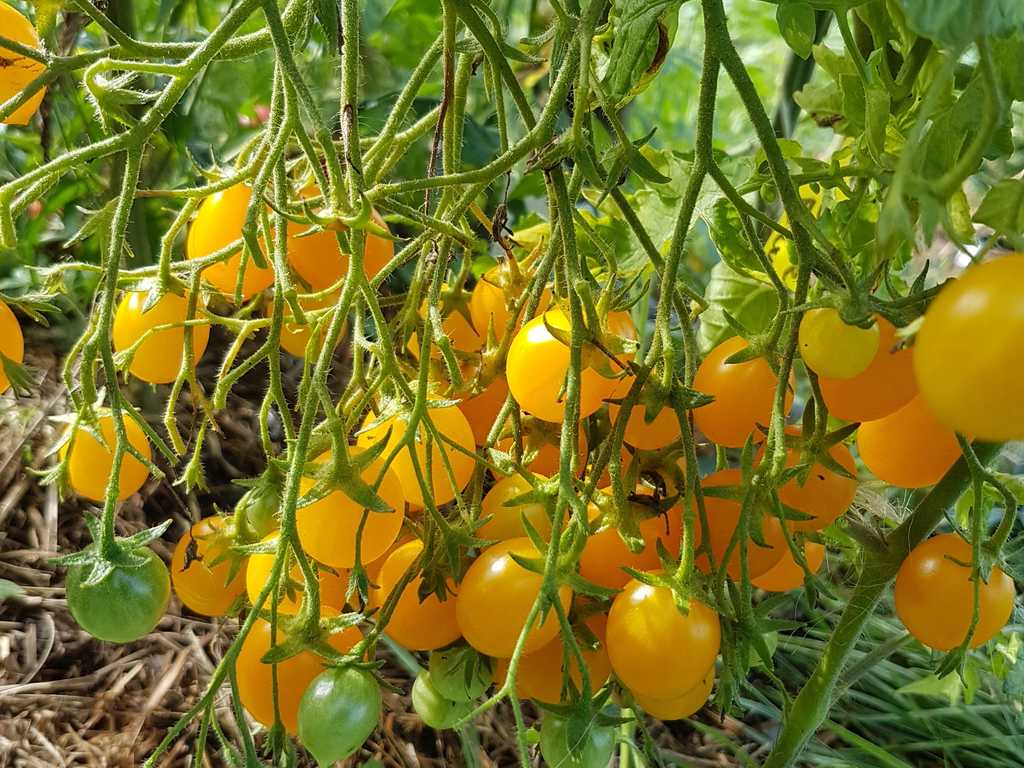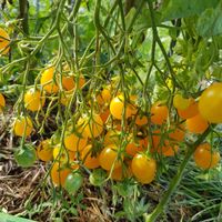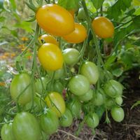 Multiflora klasar. Gammal tomatsort som. Plantan blir 1,5 m hög eller mer och ger små saftiga, söta gula tomater med oval päronform i mitten av säsongen. Tomaterna väger ca 10 g styck och spricker inte så lätt.