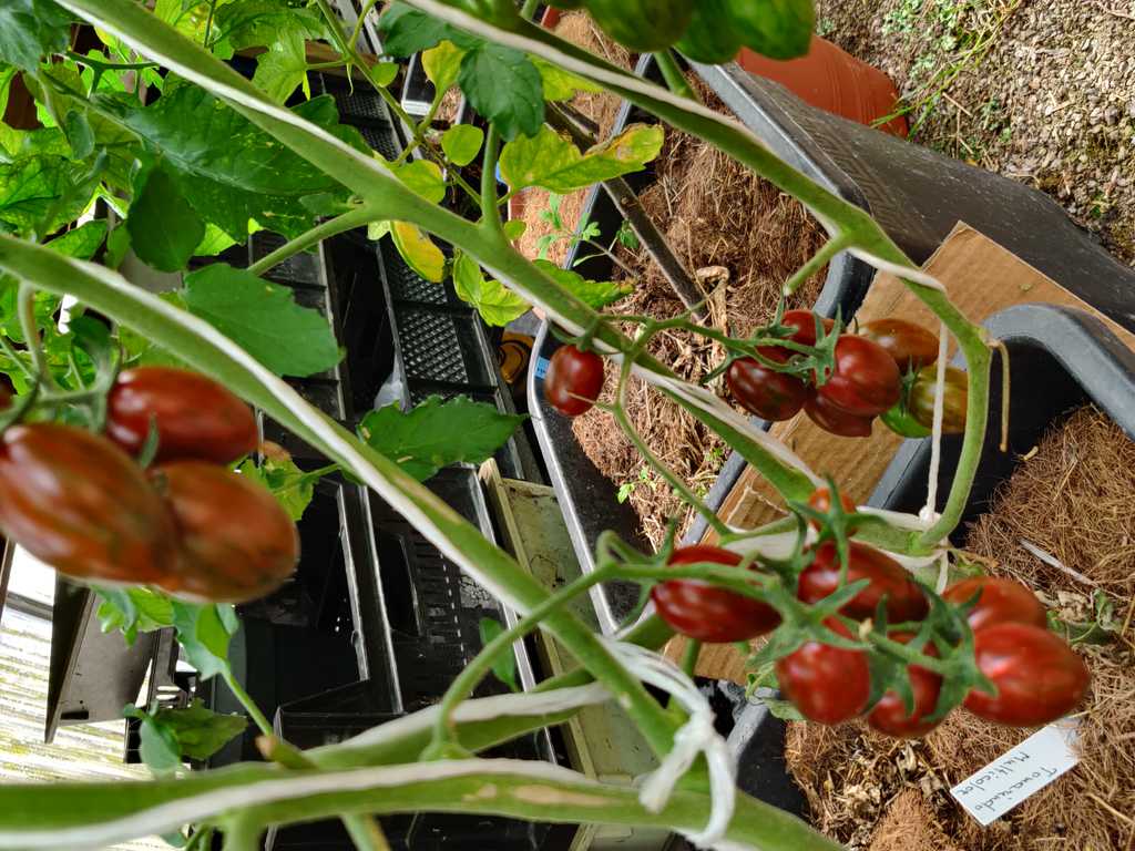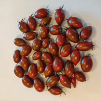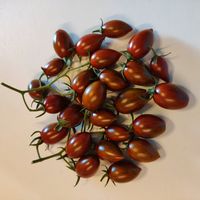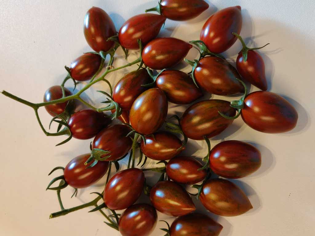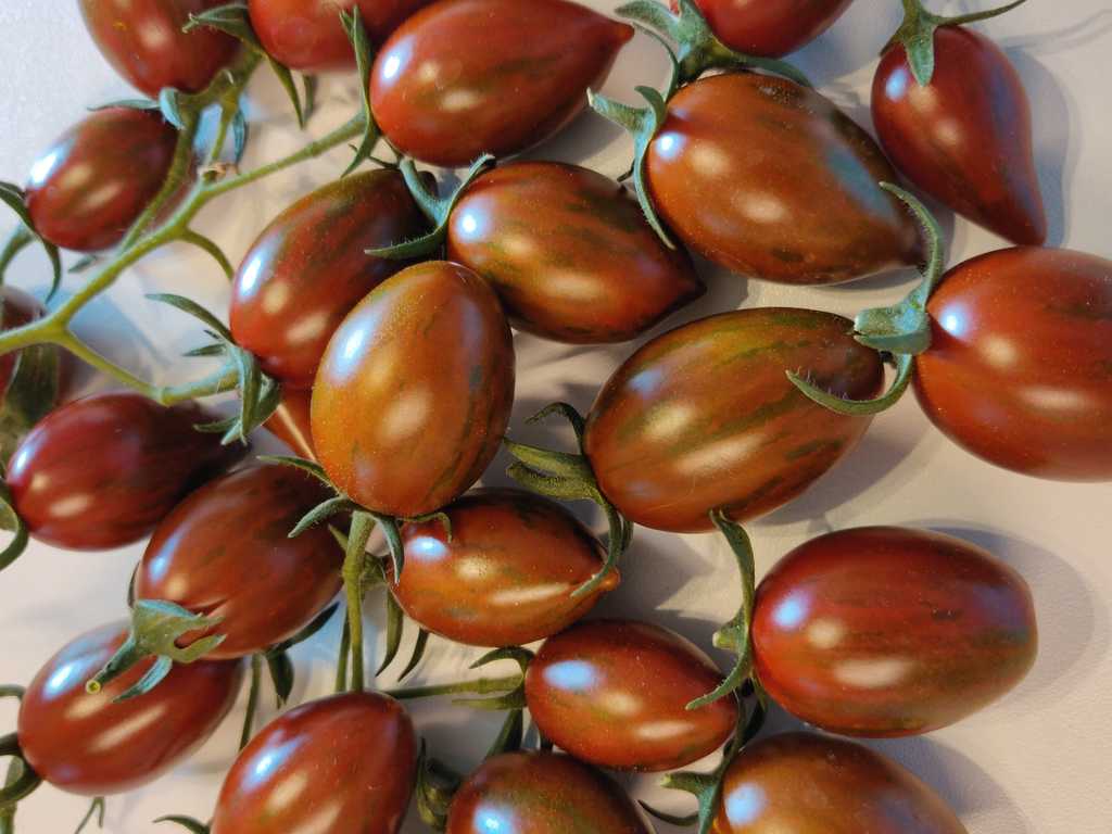 Tidig sort. Frukt som väger ca 15 gram, långsträckt plommonform som slutar i en spets. Choklad-lila skal med gröna ränder. Fast kött med en ren söt smak, lagras länge.