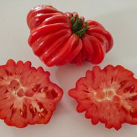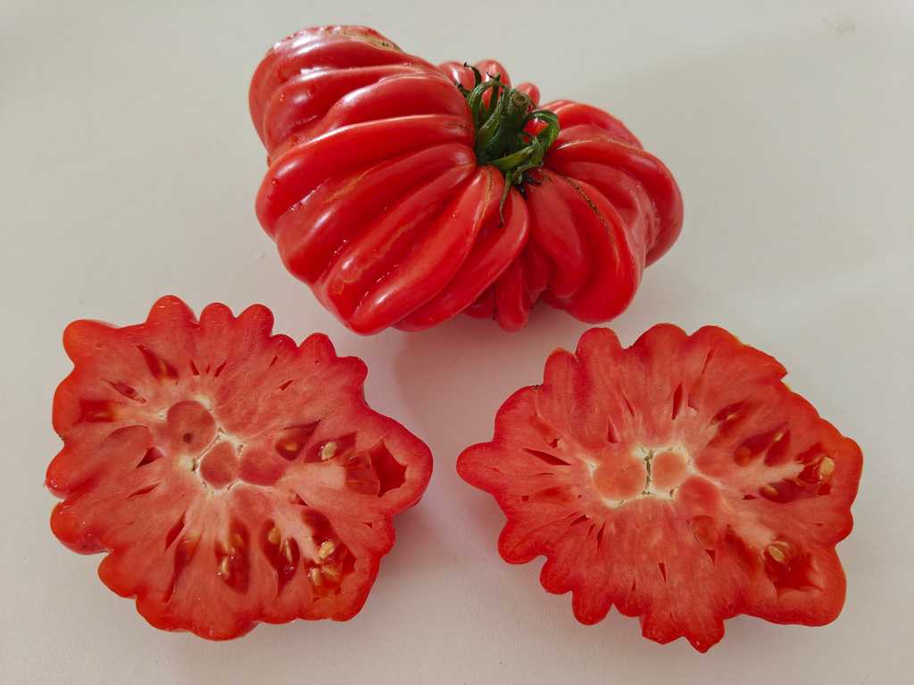 Frukterna är röda, stora, köttiga, väger 200-300 gram, intressant formade som en krysantemum blomma. Fruktkött är mycket mör, otroligt god, söt, inte så mycket frö i...