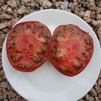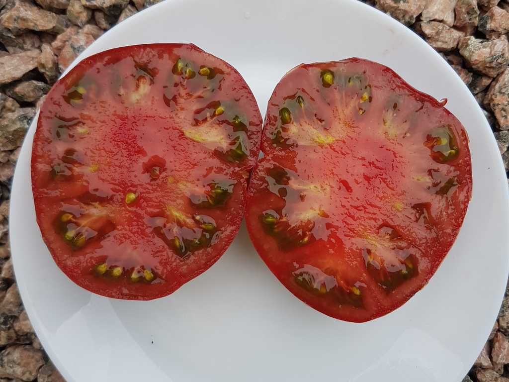 Frukt på 200 till 400 gram, bifftyp, rund och lätt tillplattad, ribbad upptill och med starkt böjda axlar för stora kalibrar. Lila epidermis, gröna axlar. Köttigt och saftigt fruktkött. Utmärkt, doftande och rik smak. Växt med medium utveckling, ganska tjock, tät bladverk, obestämd tillväxt. Bra mellansäsongsproduktion.