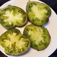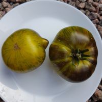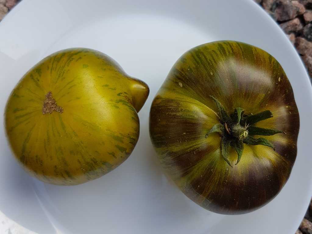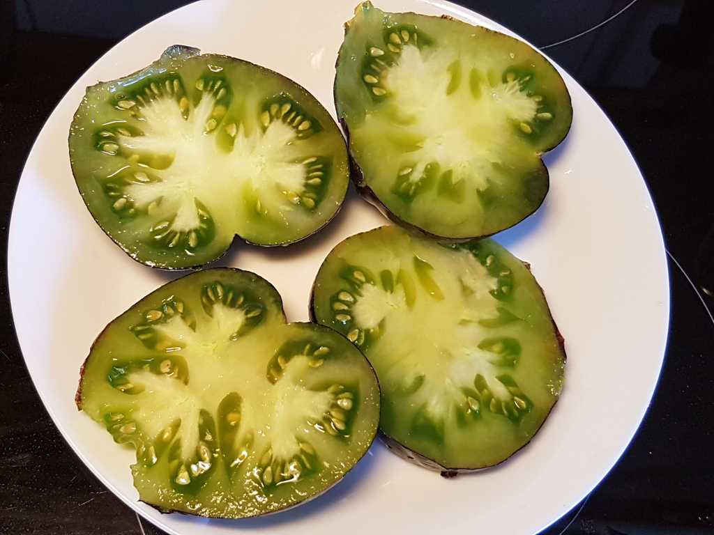 Det är en unik sort. Ljusgröna frukter, med mörkgröna ränder, blåa axlar och grönt kött inuti. Smaken är utsökt, fruktig-söt, med surhet, behagligt doftande. Vikt är 150-250 g, 180cm hög. Mycket stark fruktsättning.