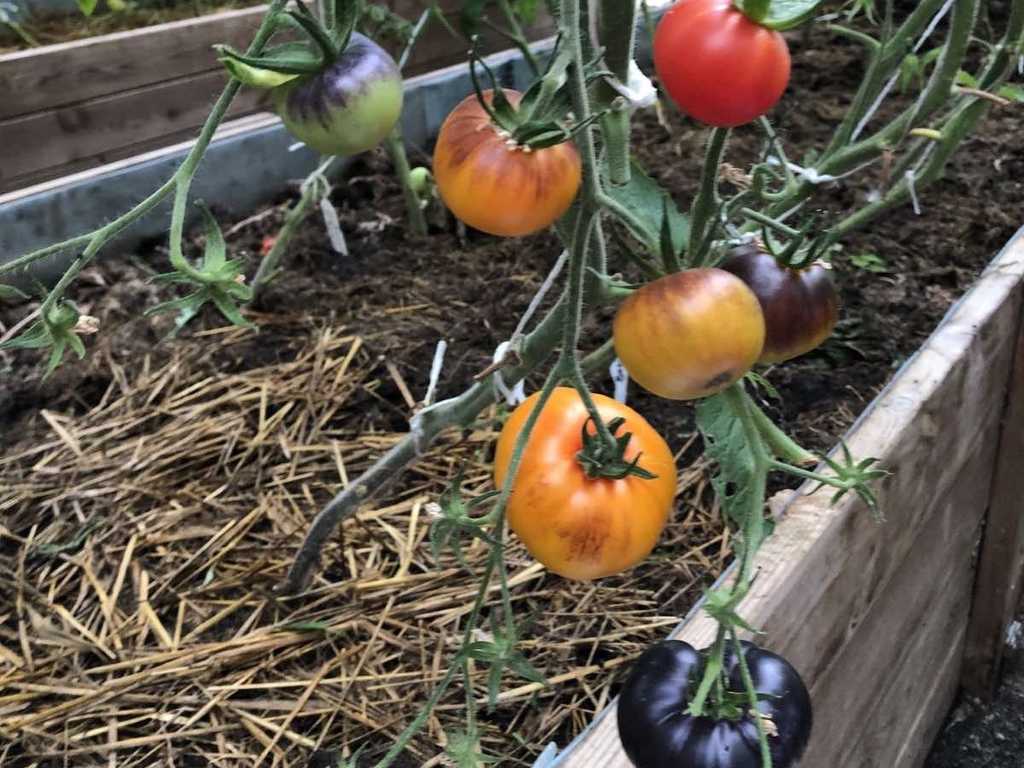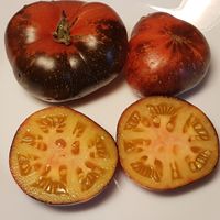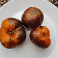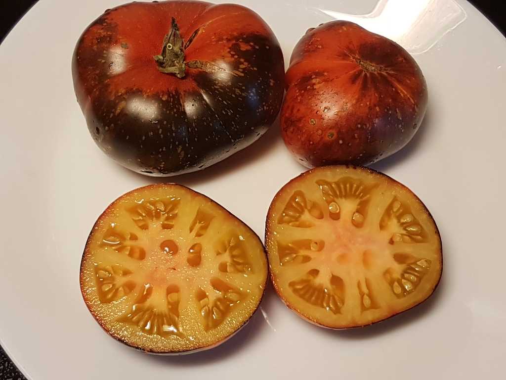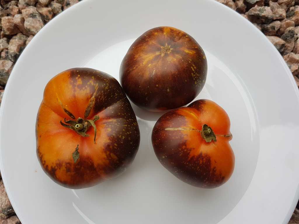 Dotter till Pomme d’or de Saint Jean de Beauregard. Mörk-orange, platta, prickiga frukter, med skarp anthocyanin färg på axlar. Fruktköttet är gul, saftig och mycket god i smaken, har lite fruktsmak. När tomater mognar då man kan se frukter med olika färger på samma buske: grön, gul blå och röd. Ute producerar mer än i växthus. Sort är sjukdomsresistent. Frukter lagras länge.